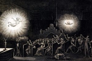 ‘The people in the tavern were engrossed in the dance. They tapped their feet, nodded their heads and shrugged along to the music… the first few stood up and mimicked his steps – but then more and more of them joined in, and then none could resist, no one could sit, everyone in the rook was dancing. There was nothing joyful about it, neither mirth nor freedom forward and back and to the left and to the right, they jumped, their bodies twitching and writhing, seemingly unleashed, yet in perfect unison and with desperate faces. No one deviated in the slightest. Paracelsus, entered, a large sword in his hand. He watched them dance with a diagnostic eye, then he gave a nighty shout. All at once the dance came to an end.’